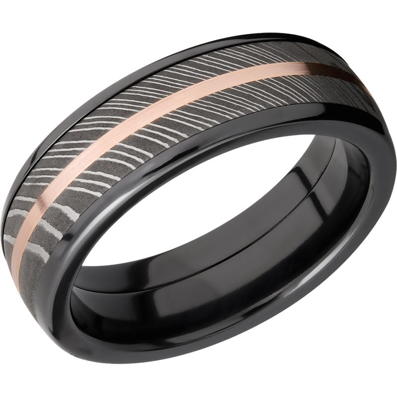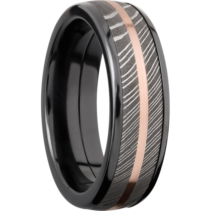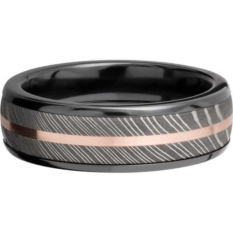 Zirconium domed 7mm band with a 5mm inlay of handmade Damascus steel and a 1mm inlay of 14K rose gold. This beautiful product isn't always in stock. Our online inventory shows everything that we produce and some products need to be made from scratch along with vendor items that we don't produce. We will call or email letting you know if the piece is available or needs to be built along with if the product needs to be sized. Current estimated build times are between 6-8 weeks.