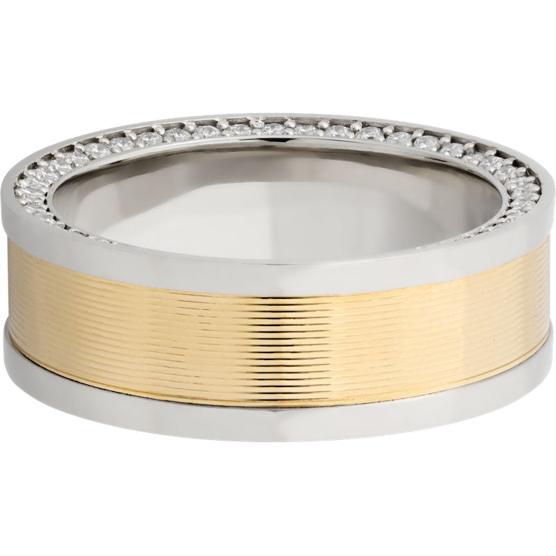 14K White gold 8mm flat band with an inlay of 14K yellow gold and bead-set .01ct side eternity diamonds. This beautiful product isn't always in stock. Our online inventory shows everything that we produce and some products need to be made from scratch along with vendor items that we don't produce. We will call or email letting you know if the piece is available or needs to be built along with if the product needs to be sized. Current estimated build times are between 6-8 weeks.