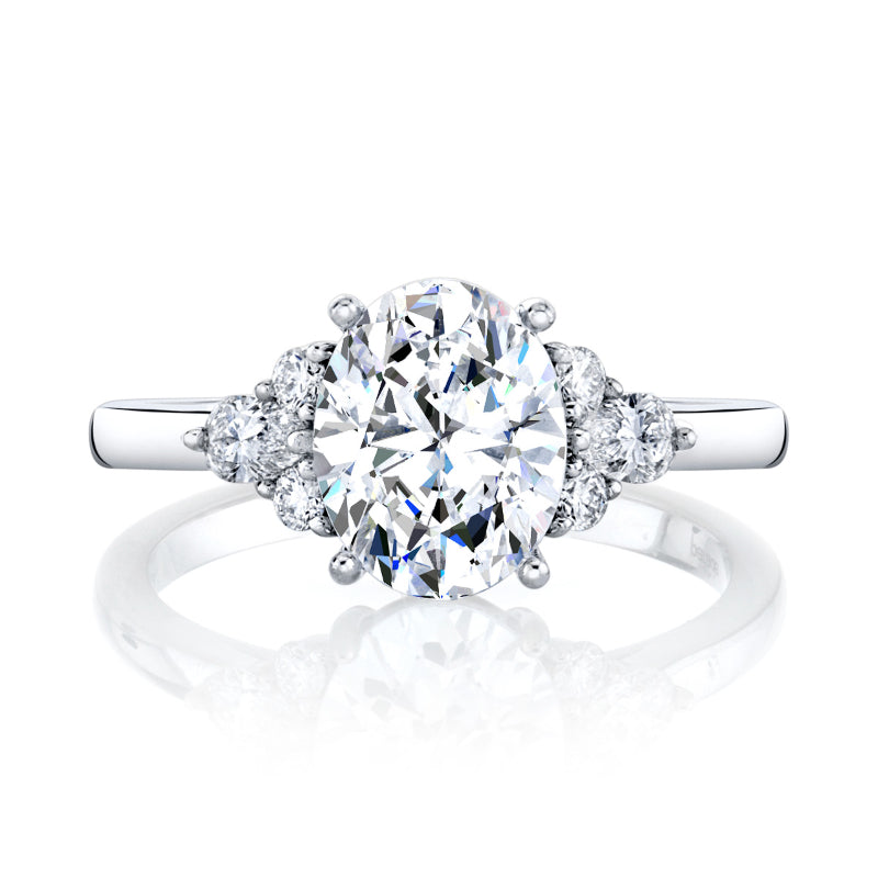This palette of fiery brilliance is created by graceful clusters of round and pearshape diamonds alongside a lovely oval beauty. Stone Information: 04-RD 0.10, 02-PD 0.20. Available in Platinum, as well as 18K White, Yellow or Rose Gold.