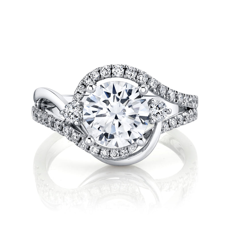 Sweeping curves of diamonds and sleek high polished 18k gold spotlight a brilliant center stone. Stone Information: 37-RD 0.35, 02-RD 0.15. Available in Platinum, as well as 18K White, Yellow or Rose Gold.