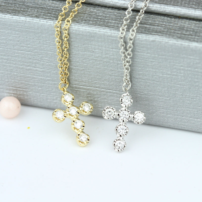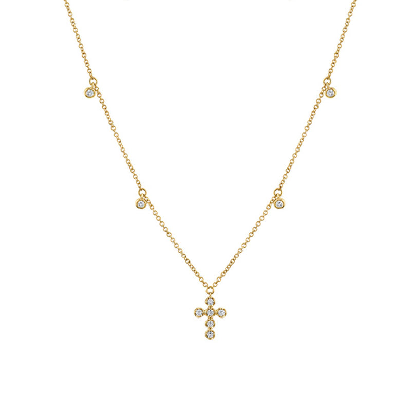 A gentle cascade of diamond drops add a loving touch to this cross necklace. Stone Information: 10-RD 0.14. Available in Platinum, as well as 18K White, Yellow or Rose Gold.